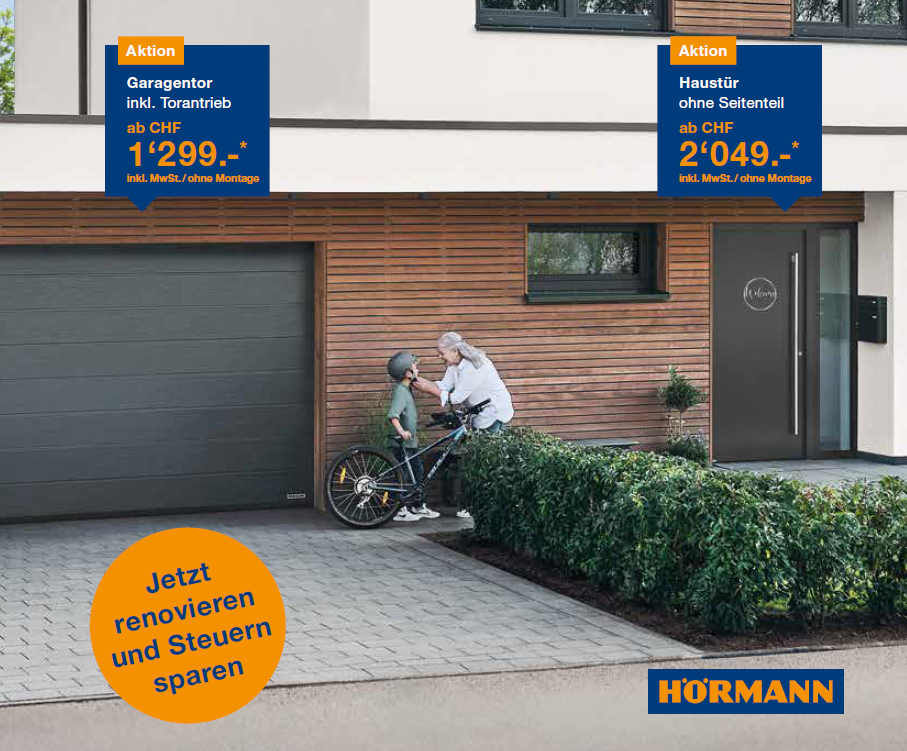 Bis zum 31. Dezember 2026 profitieren Sie von attraktiven Aktionspreisen für Garagentore, Türen sowie praktische Stauraumlösungen. Übrigens: Nutzen Sie unsere Aktionen für eine geplante Renovation, denn Renovationskosten sind voraussichtlich nur noch bis Ende 2027 steuerlich abzugsfähig.